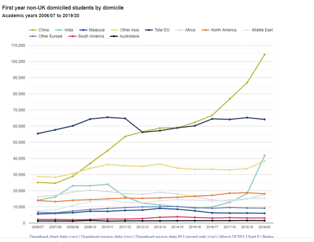 “Despite fears Brexit may impact the UK and London’s status as a global city, the number of first year overseas students from the Asia region now vastly outnumbers the total number of students from all EU countries combined.
