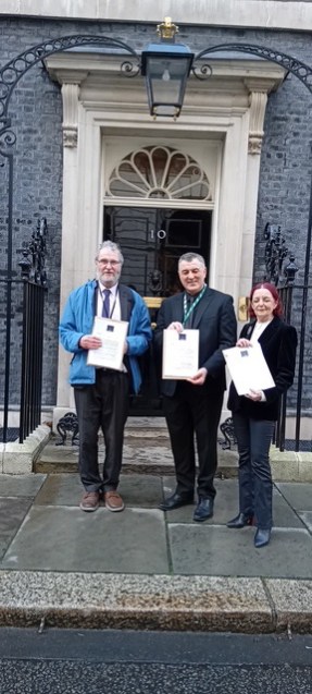 Cedar in Law delegation at Number 10 Downing Street. From Left to Right: Sharon Wheeler, Joycelene Scutt, No 10 doorman and David Hencke